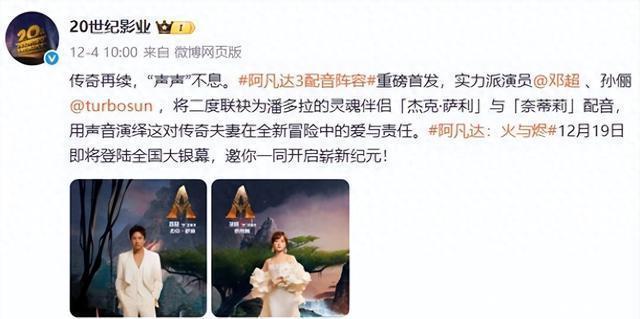 更巧的是,这仍是是邓超孙俪鸳侣俩第二次为《阿凡达》系列配音,况且从官方分解的音问看,该片子定在12月19日上映,和北好意思同步,时长三小时十五分钟。