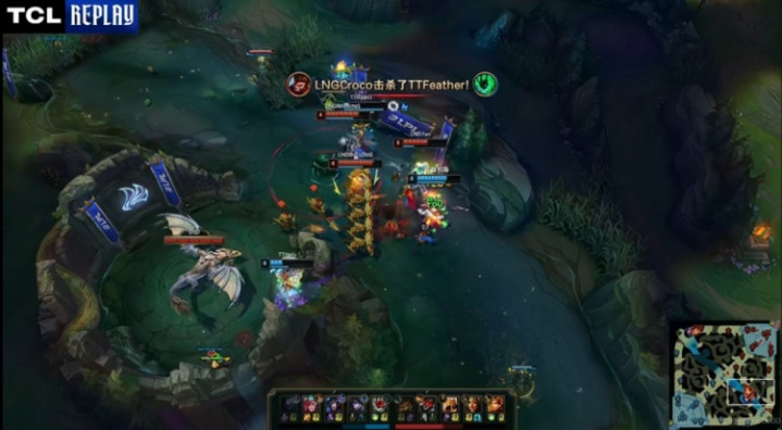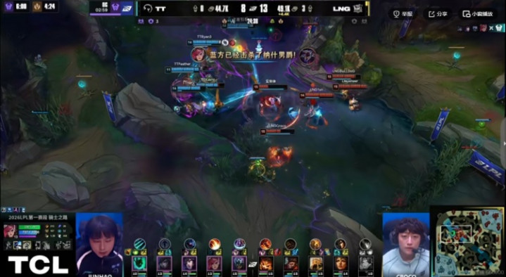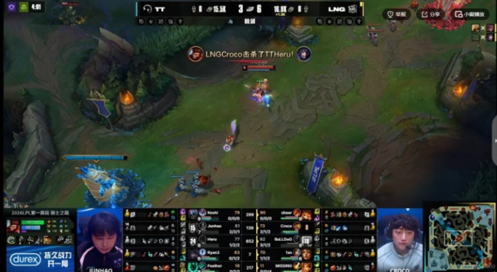 [6:10]河蟹争夺战,Croco山公交闪拼惩抢到了河蟹从而升到6级,就地开大联结队友先强杀Feather锤石拿下一血!BuLLDoG沙皇推两个,这波4V4的团战最终是LNG打出2换4,BuLLDoG沙皇双杀,2-0-2开局!