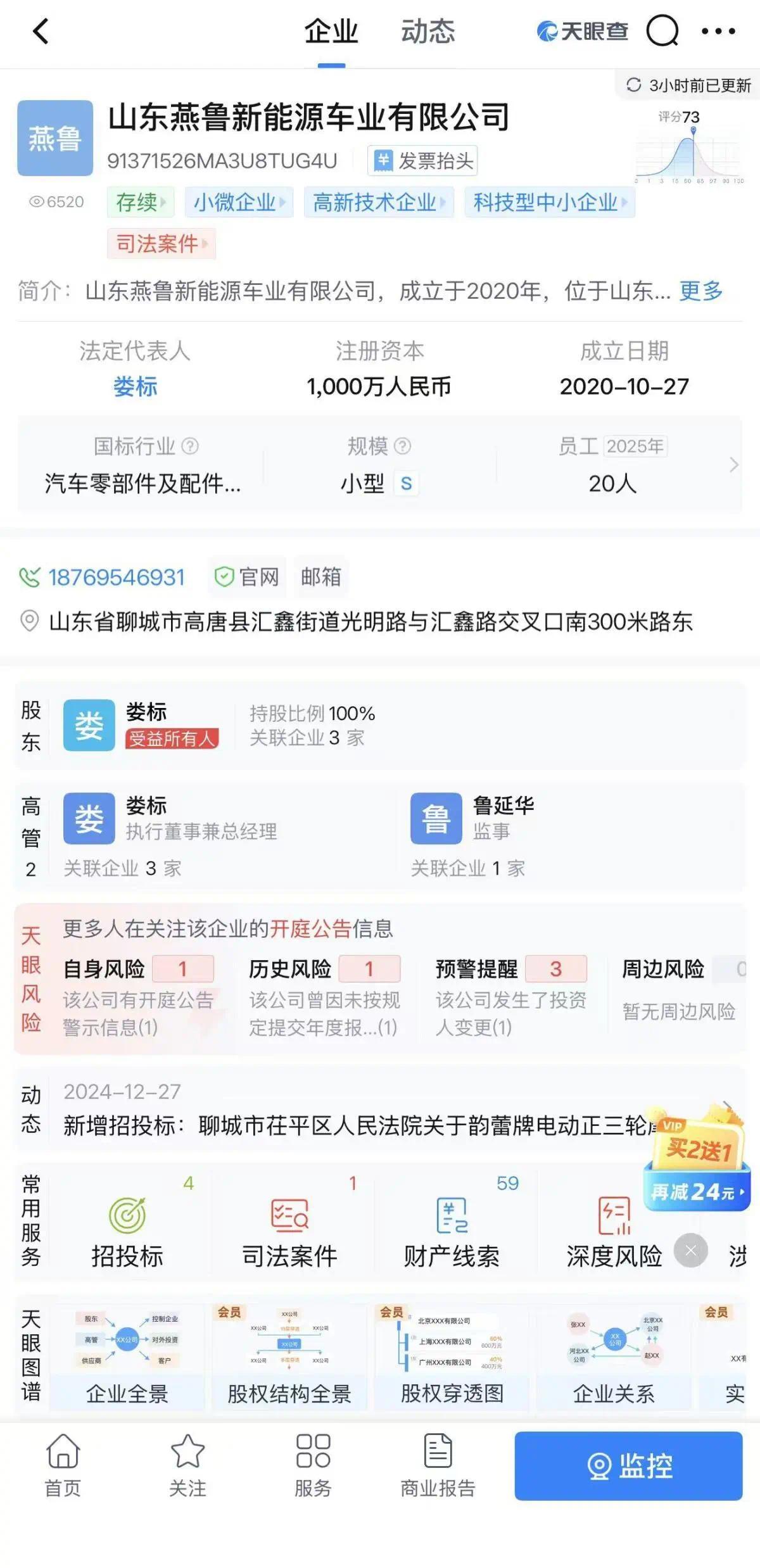 这次发起专利无效请求的公司名叫山东燕鲁新动力车业有限公司,注册地在聊城市高唐县,注册成本1000万元。