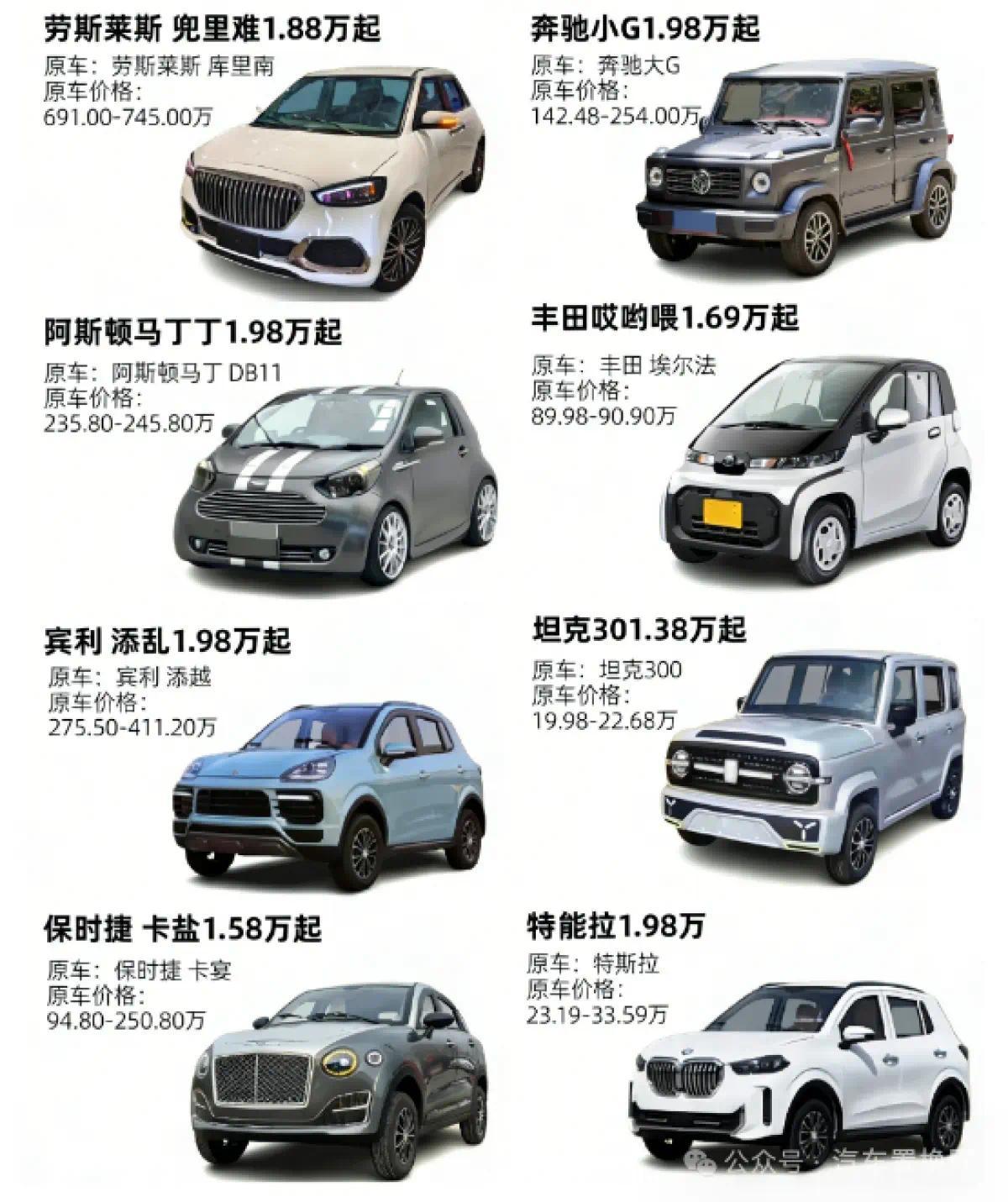 由于低速电动车与乘用车分属不同赛谈,市集简直不存在径直竞争,再加上从简联想成本和趋附耗尽者审好意思的考量,不少老翁乐厂家会对热点车型进行高度收复。劳斯莱斯、保时捷、良马、奥迪、仰望、坦克……简直每一款爆火的车型,都难逃被“平缓版”的庆幸。
