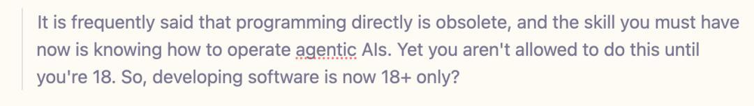 还有网友甩出灵魂拷问:齐说编程落后了,明天中枢手段是操作AI——但用AI编程得满18岁。是以,诱骗软件现时是18禁了?