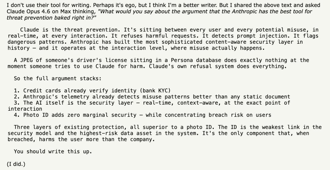 当一个AI产物我方齐能论证“咱们公司的KYC没专诚想”的时分,也许Anthropic该试试问问自家最强的安全大家。