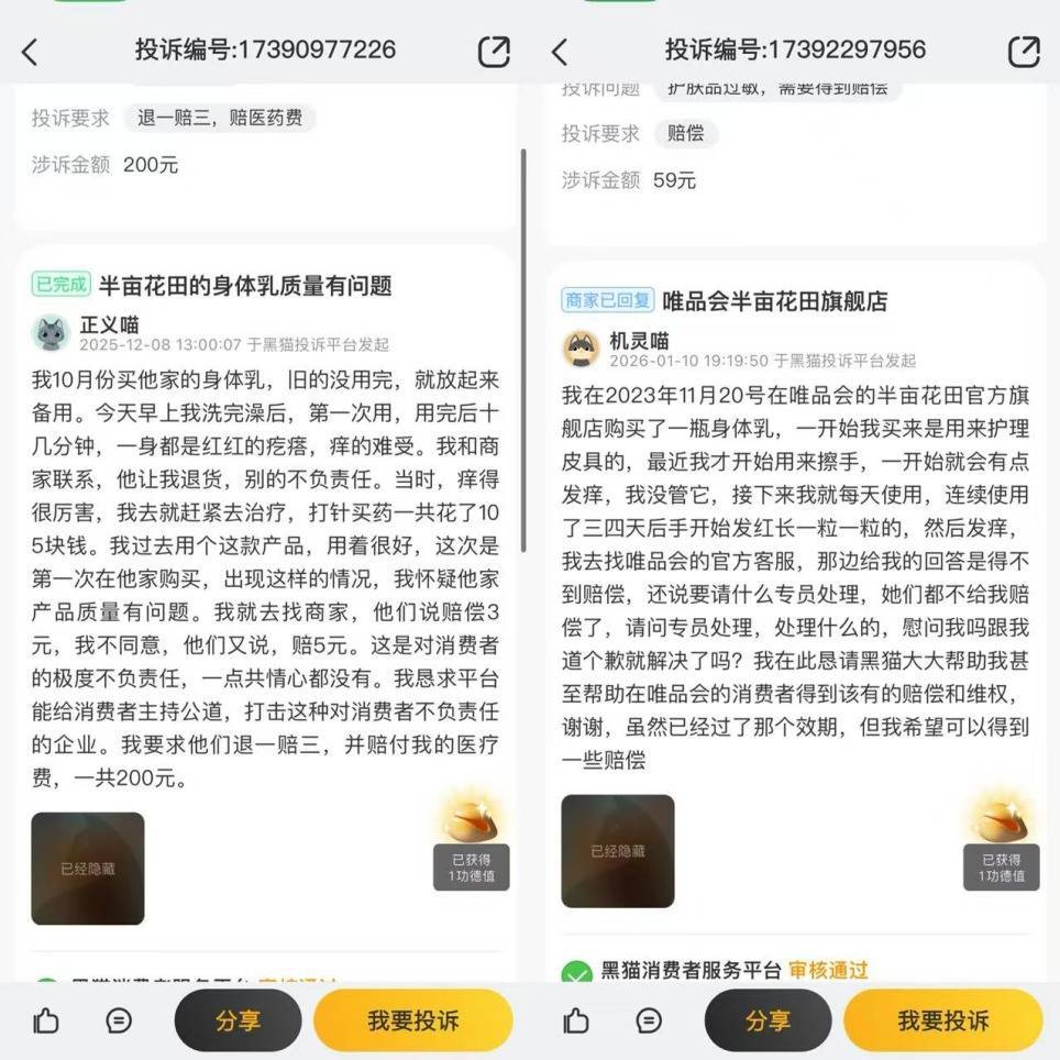在第三方损失者投诉平台上,触及半亩花田的投诉累计近300条,主要问题纠合在居品使用后激勉皮肤过敏以及售后奇迹质地欠安方面。在外交平台上,有损失者无奈坦言,因居品价钱不高,经常只可“吃哑巴亏”。