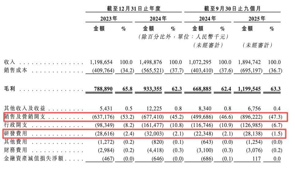 半亩花田的销售及营销开支终年占据收入的近半壁山河,2023年至2025年前9个月,这项用度别离为6.37亿、6.77亿和8.96亿元,占总收入的比例别离为53.2%、45.2%和47.3%。
