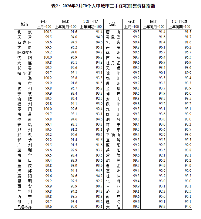 北京2月二手住宅价钱环比+0.3%(前值-0.2%),同比-8.4%(前值-8.7%)。